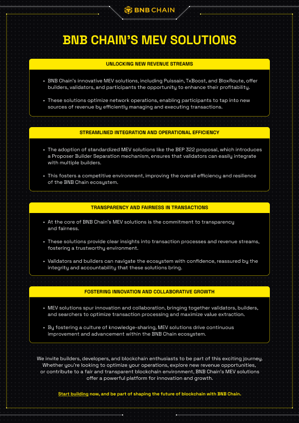Innovation and Collaboration: MEV solutions spur innovation and collaboration, bringing together validators, builders, and searchers to optimize transaction processing and maximize value extraction. By fostering an environment of collaboration and knowledge-sharing, MEV solutions drive continuous improvement and advancement within the BNB Chain ecosystem.