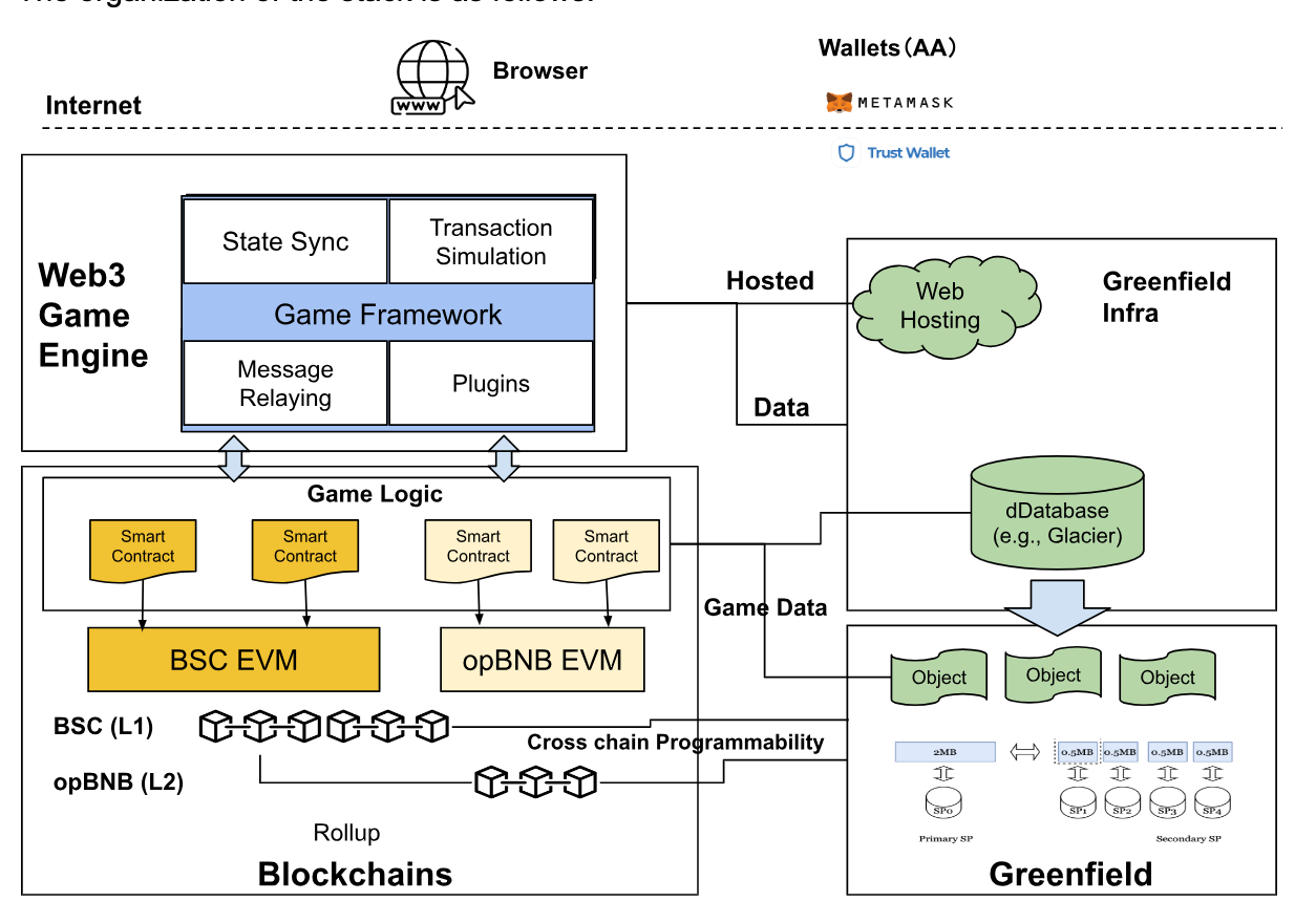 To map the Web3 FoC games infrastructure within BNBChain, it's divided into various modules. The organization of the stack is as follows: